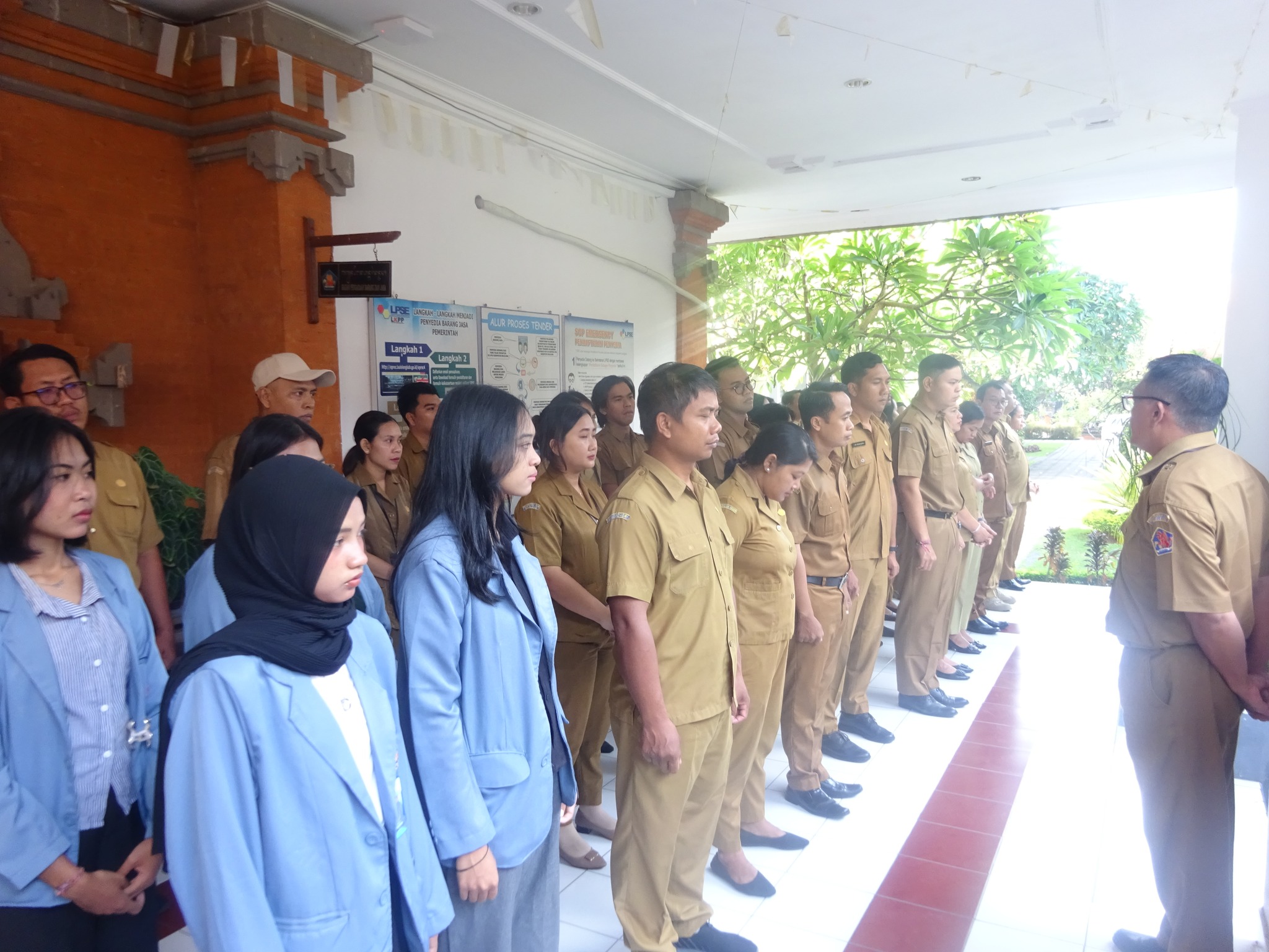 Singaraja, PASTI PBJ// Kepala Bagian Pengadaan Barang dan Jasa (PBJ) Setda Kabupaten Buleleng, I Made Suwitra Yadnya memimpin apel pagi yang diikuti oleh seluruh staf dan mahasiswa magang bertempat di halaman Sekretariat BPBJ Buleleng, Senin (20/10).