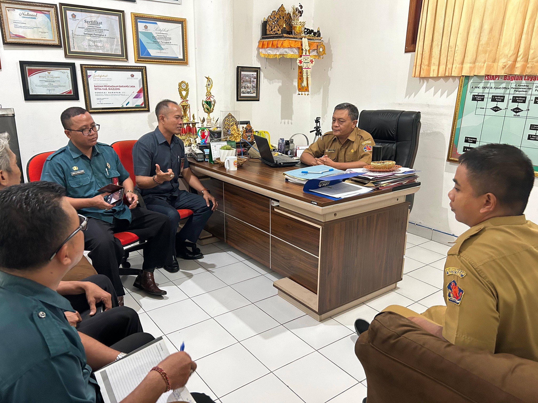 Singaraja, PASTI PBJ// Didampingi JF Ahli Muda, Kepala Bagian Pengadaan Barang dan Jasa (Kabag PBJ) Setda Kabupaten Buleleng, I Made Suwitra Yadnya, menerima Direktur PD. Pasar Argha Nayottama beserta jajaran dalam rangka koordinasi pengadaan barang dan jasa pada Badan Usaha Milik Daerah (BUMD). Kegiatan tersebut berlangsung di ruang kerja Kabag PBJ, Senin (26/1).